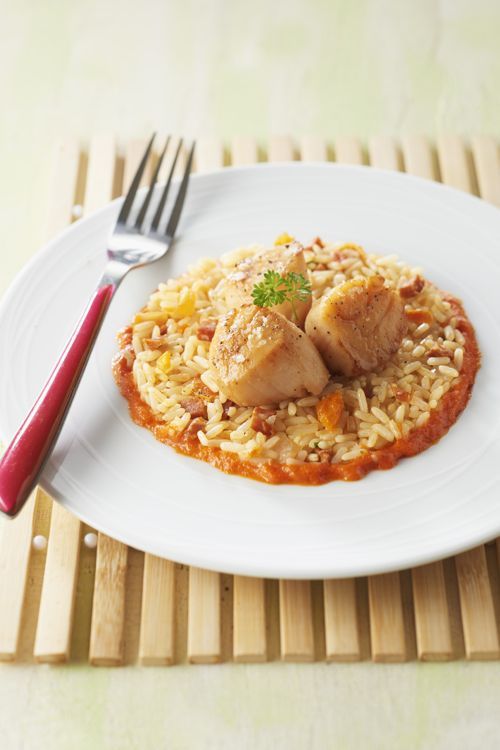 Pour servir, disposez le riz dans une assiette, ajoutez les noix de Saint-Jacques sur le dessus et nappez délicatement le tout de sauce au poivron rouge. Commandez vos convives à savourer ce délicieux plat qui allie fraîcheur et gourmandise.