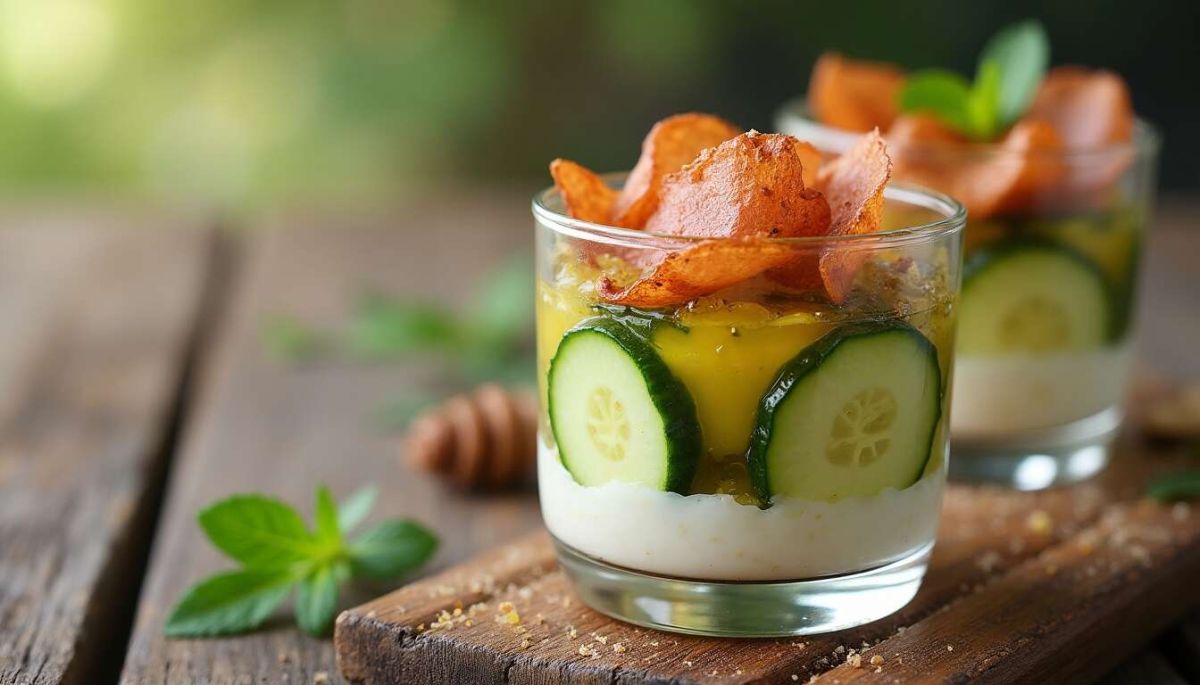 Les verrines associant fromage de chèvre frais, concombre et porc séché constituent une entrée parfaite pour vos repas d'été ou pour éblouir vos invités lors d'un apéritif dînatoire. Faciles à concocter, ces petites bouchées allient fraîcheur et saveurs intenses, garantissant un moment convivial. Découvrez comment réaliser cette délicieuse recette.
