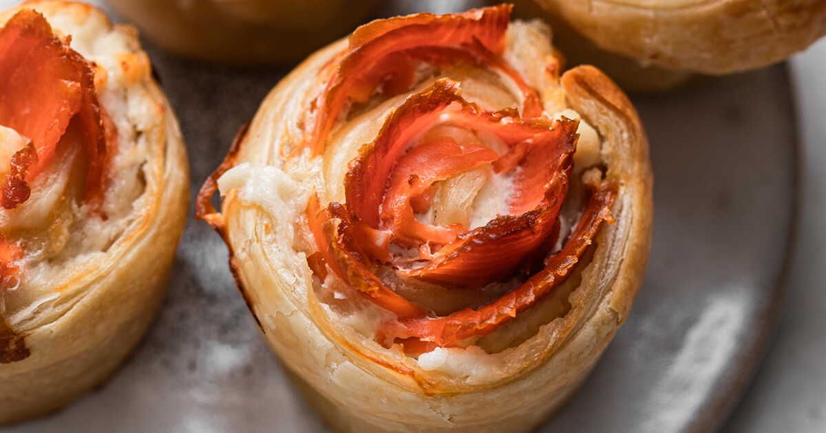 Étalez une pâte feuilletée de qualité sur un plan de travail. Découpez-la en bandes de 5 cm de large. Tartinez chaque bande de fromage frais à l'ail et aux herbes, puis ajoutez des tranches de saumon fumé. Roulez délicatement pour former de jolis roses et placez-les dans un moule à muffins. Enfournez 10 minutes à 180 °C. Pour varier les plaisirs, n’hésitez pas à utiliser du jambon, du fromage ou même des pommes.