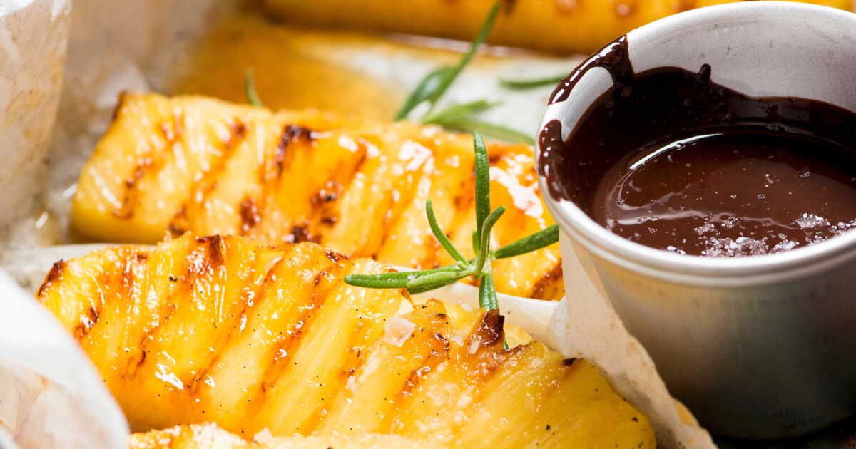 Servez vos tranches d’ananas chaudes, nappées de sauce chocolat. Ce dessert allie la douceur de l’ananas à l’amertume du chocolat, créant un équilibre parfait pour les amateurs de sucré.