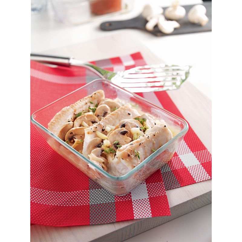 3) Coupez le poisson en portions, assaisonnez avec du sel et du poivre, puis alternez dans le plat avec les champignons.