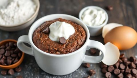 Pour une touche élégante, servez votre mugcake dans une tasse en céramique aux couleurs pastel, accompagnée d'une petite assiette à gâteau et d'une cuillère en inox. Cela apportera une touche de sophistication à votre service.
