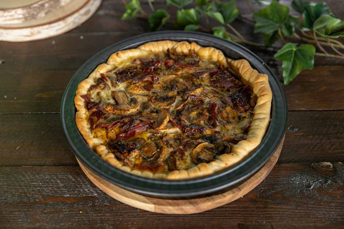 - Étalez la pâte brisée dans un plat à tarte et piquez le fond. Étalez une fine couche de moutarde et ajoutez la préparation aux champignons.