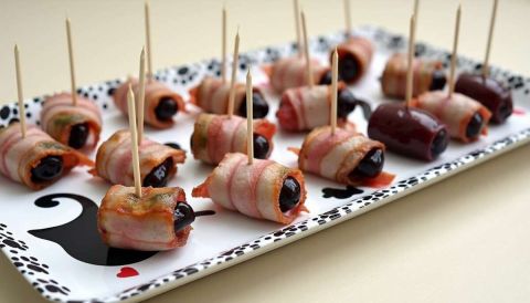 2. Enveloppez chaque pruneau avec une demi-tranche de lard, puis fixez le tout avec un cure-dent pour maintenir la forme.