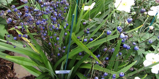 En juin, le dianella se pare de panicules lâches de fleurs étoilées, d'un bleu lavande délicat, avec des anthères jaunes. Ces fleurs pendent gracieusement de hampes atteignant 50 cm. À la fin de l'été, ces fleurs laissent place à des baies bleu foncé, offrant une note d'exotisme à la plante.