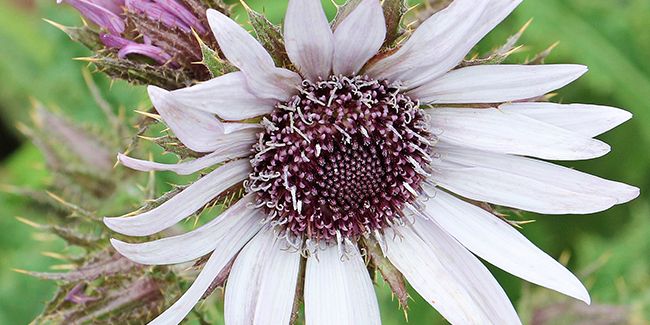 Les tiges portent, en été, de superbes fleurs lilas avec un cœur pourpre, disposées en capitules évoquant des marguerites, mesurant entre 8 et 10 cm de diamètre. Ces fleurs, entourées de grandes bractées vertes épineuses, forment des corymbes attrayants, attirant une multitude d'insectes butineurs, tels que les abeilles et les papillons.
